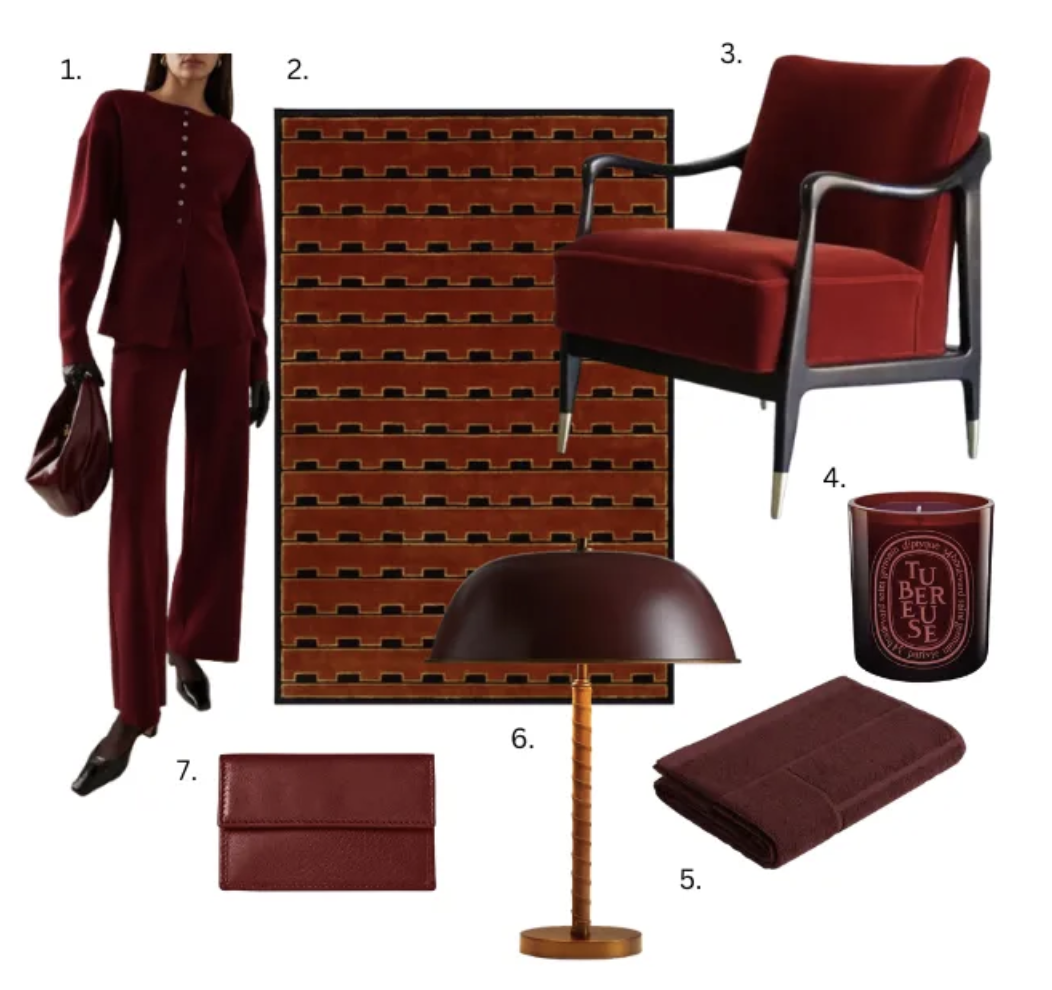 I love pairing it with camels, greens, and various wood tones. This moody color feels both sophisticated and intimate—lush, yet easy on the eyes. It also works beautifully across different fabrics, like velvet in the winter and linen in the summer. Here are a few other pieces I’m eyeing right now: